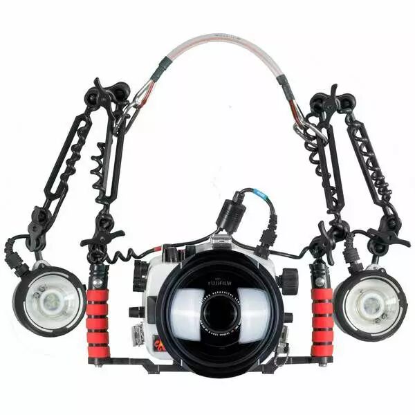 IkeliteSi vous utilisez notre système de bras fendus, les mousquetons peuvent être fixés dans les fentes des deux bras les plus proches des poignées, permettant au câble de monter et descendre librement. Pendant le transport, faites glisser le câble dans les fentes pour que les bras puissent se replier. Le fait de suspendre plus bas les stroboscopes et le boîtier offre une répartition du poids très naturelle, similaire à celle d'un sac de sport. Ceci est idéal pour déplacer le système, en particulier pour le remettre dans et hors de l'eau.