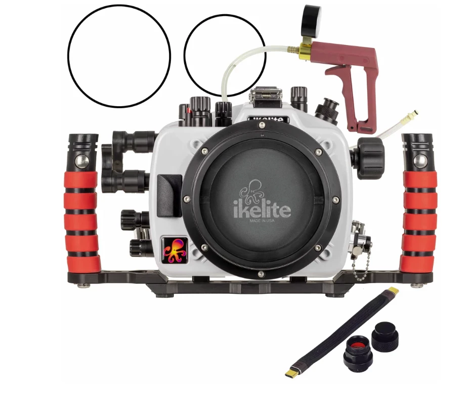 Nous avons configuré le caisson sous-marin Deluxe 200DL pour les appareils photo Sony a1 et a7S III exactement comme nous l'utiliserions, avec un double plateau à double poignée, des extensions de déclencheur, une pompe à vide, un port de chargement et de transfert de données USB-C et un jeu de joints toriques de rechange.