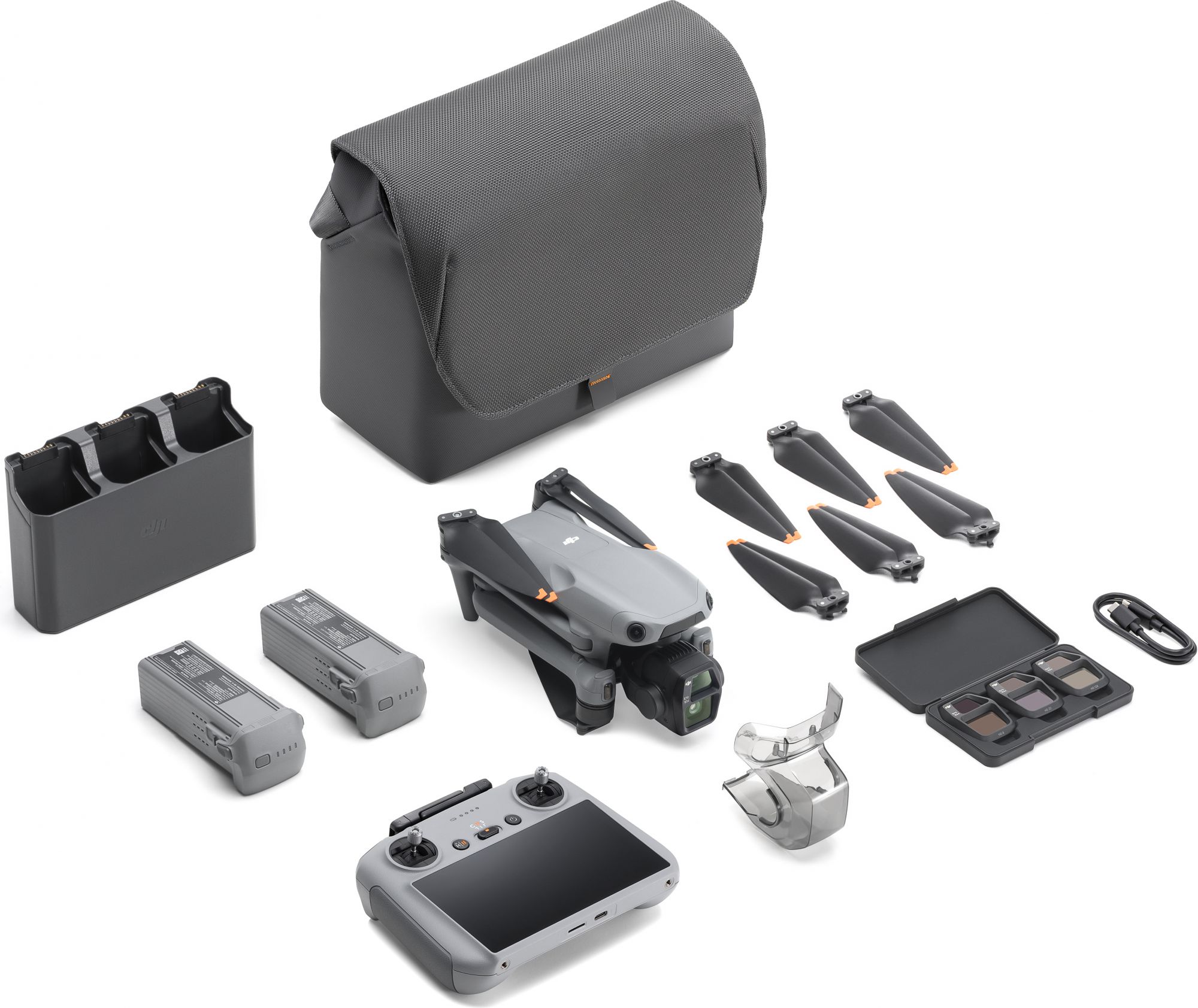 Les accessoires Fly More supplémentaires vous permettent de transporter votre matériel en toute sécurité et de rester en vol plus longtemps. Vous disposez de deux batteries de vol intelligentes supplémentaires qui prolongent votre temps de vol de 90 minutes. Vous disposez également de deux paires d'hélices silencieuses supplémentaires, d'un sac bandoulière, d'un pack de 3 filtres ND (ND8, ND32 et ND128) et d'un chargeur de batterie. Les filtres permettent de réduire la vitesse d'obturation, et le chargeur peut charger jusqu'à 3 batteries séquentiellement. Une fonction d'accumulation d'énergie vous permet de voler encore plus rapidement en transférant la charge des batteries faibles vers la batterie la plus chargée.