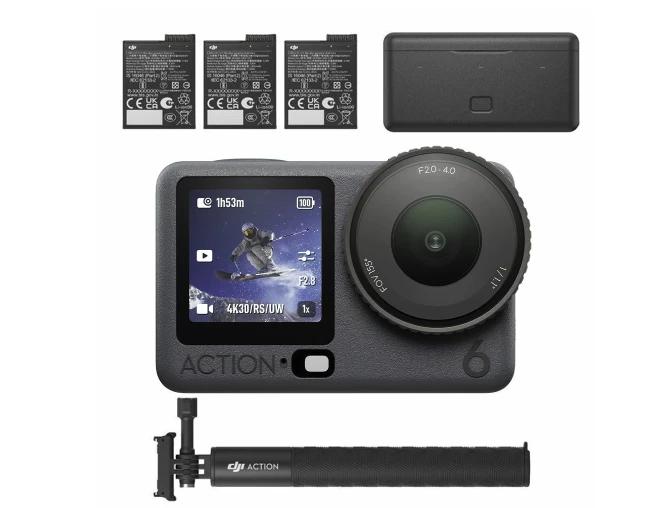 Capturez des vidéos fluides et nettes jusqu'en résolution 4K120 où que vous soyez avec le kit Osmo Action 6 Adventure de DJI . L'Osmo Action 6 est dotée d'un nouveau capteur carré 1/1,1", du mode Starburst, d'une ouverture variable de f/2 à f/4, et offre désormais 50 Go de stockage interne. Elle est également plus résistante au froid. Elle conserve ses deux écrans OLED haute luminosité, ses systèmes de stabilisation RockSteady et HorizonSteady, son capteur 38 MP, son autonomie de 4 heures et son boîtier étanche avec manomètre. Parmi ses autres fonctionnalités, citons la prise de photos en 8K, le centrage et le suivi du sujet, la compatibilité OsmoAudio, l'enregistrement RAW, un champ de vision de 155° et un emplacement pour carte SD compatible avec les cartes jusqu'à 1 To.