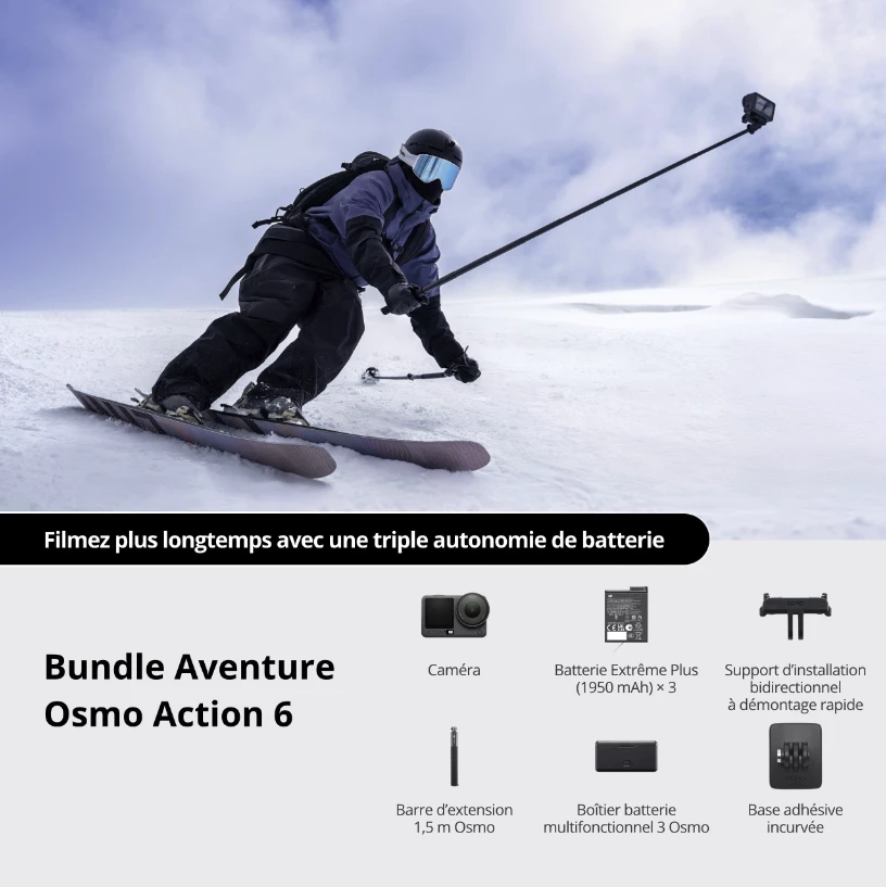 Comprend également deux batteries extreme Plus (1 950 mAh), un support d'installation à démontage rapide bidirectionnel, un étui de batterie multifonctionnel 3 et une perche d'extension de 1,5 m, permettant de longues prises de vue en extérieur sans effort.