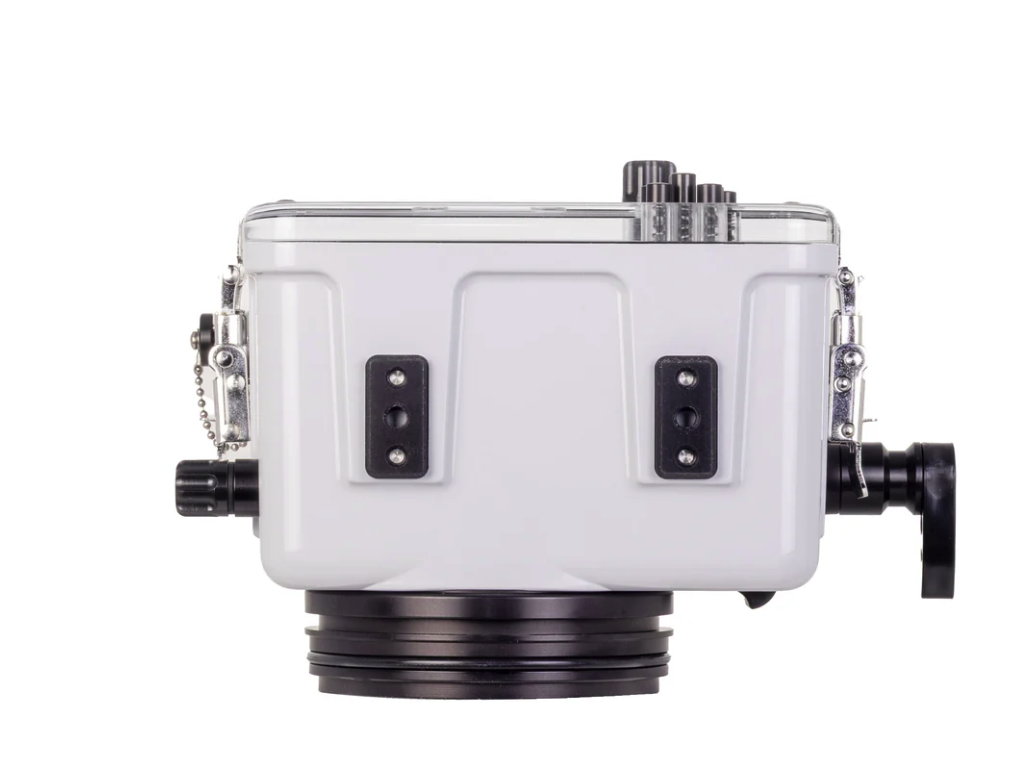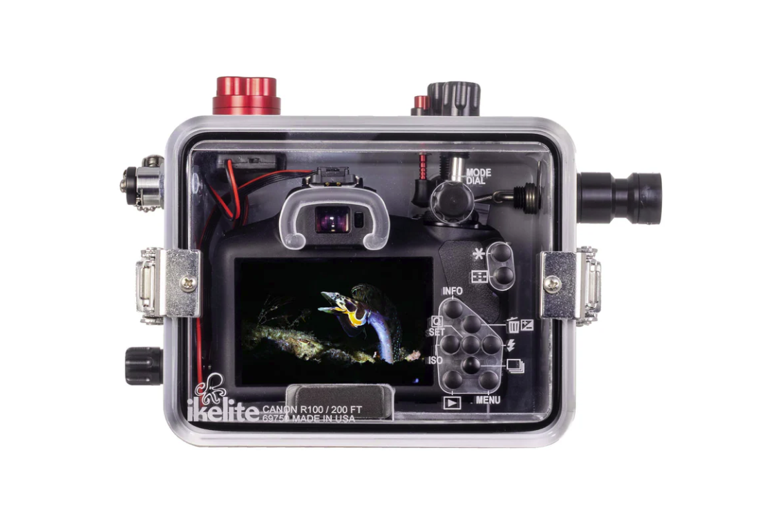 IkeliteLe caisson étanche 200DLM pour Canon EOS R100 est équipé de tout ce dont vous avez besoin pour emmener votre appareil photo sous l'eau, y compris un émetteur TTL à fibre optique, un double plateau avec doubles poignées, un système de détection de fuites sous vide et un jeu de joints toriques de rechange.