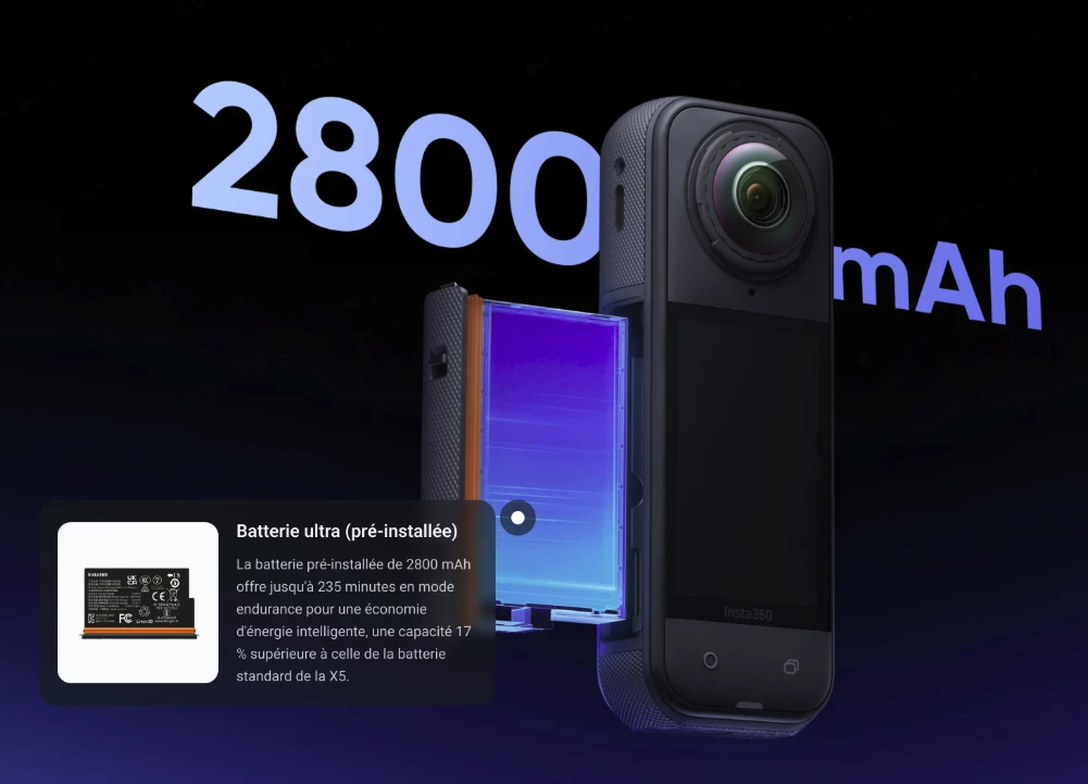 Le X5 offre une capacité de batterie supérieure à celle de son prédécesseur grâce à sa batterie amovible de 2400 mAh. Il a été testé pour fonctionner en mode vidéo 360° 5,7K30 avec une durée d'enregistrement allant jusqu'à 135 minutes. En mode Endurance, il peut enregistrer en 5,7K30 pendant 185 minutes maximum, et en mode 8K30, jusqu'à 88 minutes.