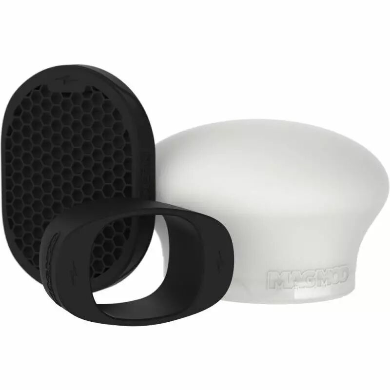 Le MagMod Starter Flash Kit 2 comprend les deux modificateurs les plus essentiels du système MagMod. Le kit comprend la grille MagGrid 2 et le dôme MagSphere 2. Le troisième élément est l'adaptateur MagGrip 2, qui se fixe sur la tête du flash et constitue une base magnétique permettant de remplacer facilement les deux autres modificateurs. L'adaptateur est optimisé pour les flashs à tête ronde, mais convient également aux flashs standard.