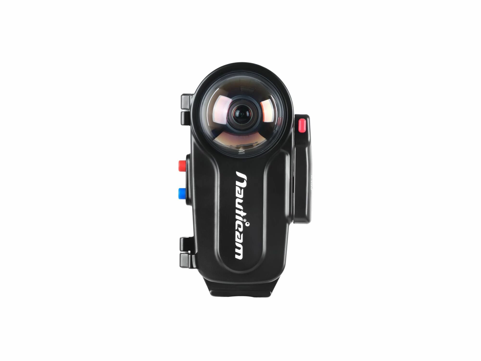 Le caisson Nauticam pour l'Insta360 X5 est conçu avec des optiques haut de gamme intégrées dans un boîtier métallique robuste. Fabriqué en alliage d'aluminium anodisé dur, il est étanche jusqu'à 100 mètres de profondeur. Une version 150 mètres sera également disponible. Comme tous les caissons Nauticam, il est doté de commandes ergonomiques intuitives, incluant un verrouillage rotatif, un bouton-poussoir rouge pour la mise sous tension et un bouton-poussoir bleu pour l'accès rapide. Chaque objectif offre un angle de champ de 190° et se compose de trois éléments répartis en deux groupes. Ces objectifs bénéficient d'un traitement antireflet et leur distance de mise au point s'étend de 0 à l'infini. Pour utiliser le caisson, il est nécessaire de retirer les lentilles externes d'origine (une de chaque côté) de la caméra Insta360 X5 à l'aide de l'outil fourni. Une fois la porte arrière fermée, la caméra active automatiquement le mode plongée à l'intérieur du caisson. Le caisson dispose d'un filetage 1/4"-20 et de deux filetages M5 pour la fixation.