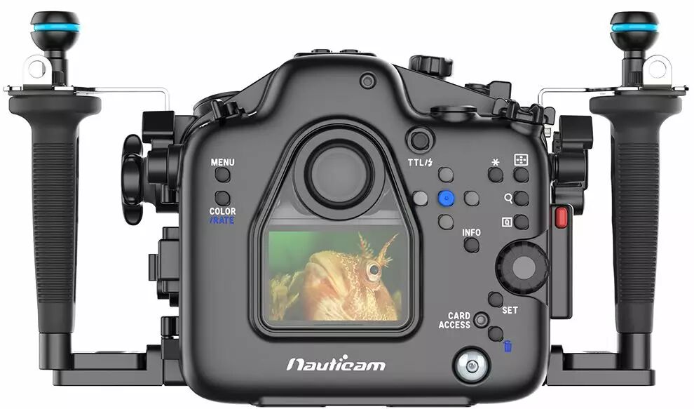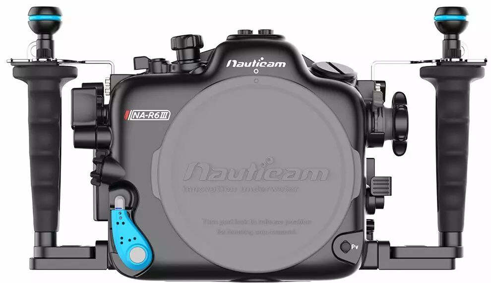 Les ingénieurs de Nauticam sont obsédés par l'idée d'offrir au créateur d'images sous-marines un accès sans entrave à toutes les commandes nécessaires, avec autant de commandes à portée de main des poignées caoutchoutées ergonomiques. Cette philosophie de contrôle de mission s'étend au NA-R6II où un levier à double pouce et un sous-levier sont placés près de la poignée droite. Le double levier de pouce sur le côté avant droit active les boutons "M-Fn" et "Rec" tandis que le sous-levier sur le côté arrière droit correspond au bouton "AF-ON". Près de la poignée gauche se trouve un levier de pouce pour "Lecture" pour un examen facile des images.