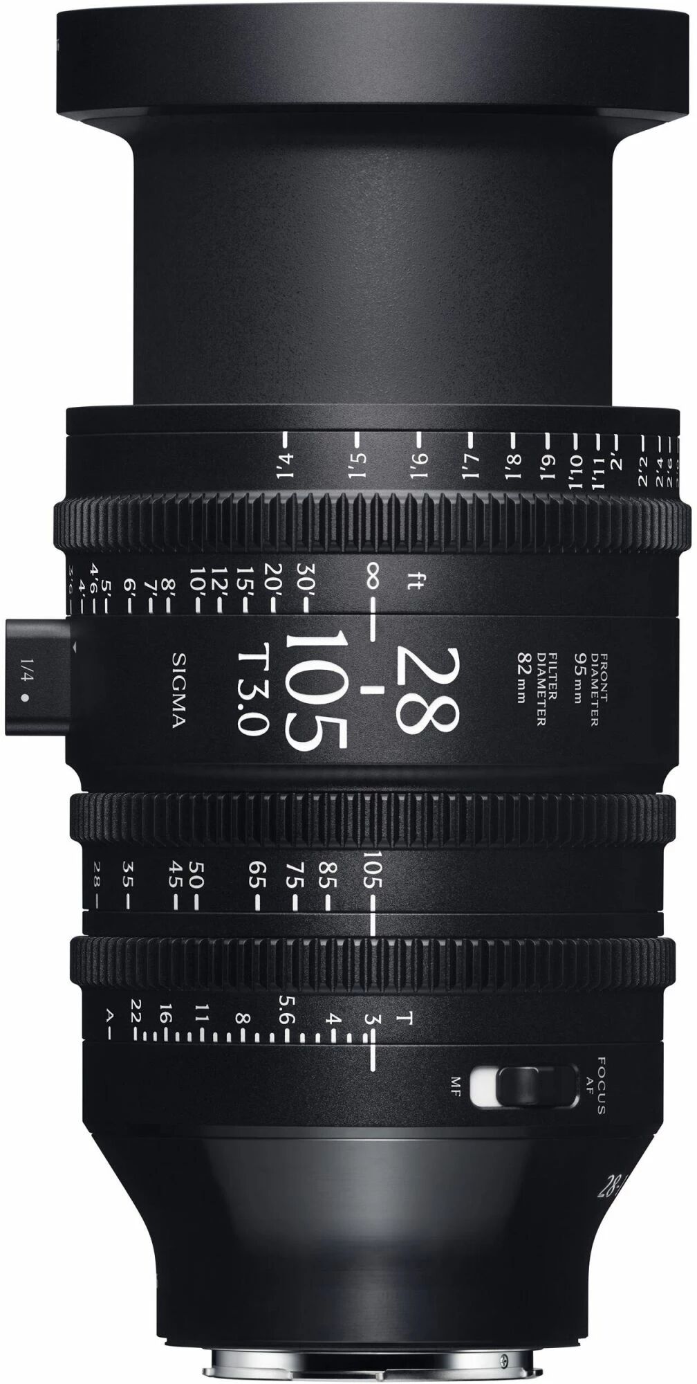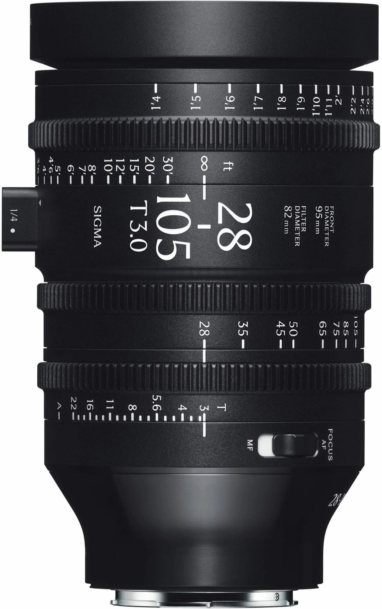 L'objectif présente un diamètre frontal de 95 mm pour une compatibilité avec une grande variété de matte boxes et intègre un filetage de filtre frontal de 82 mm.